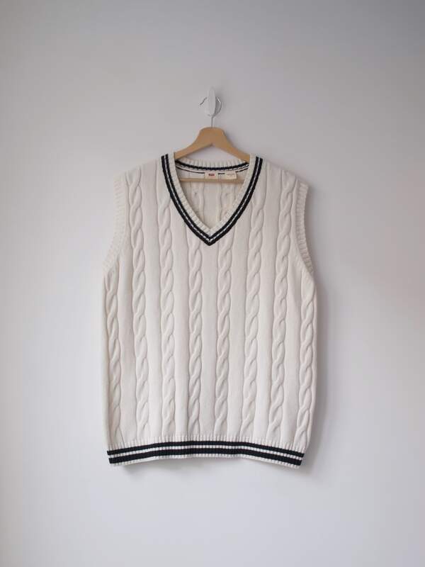 Bezrękawnik marki Levis, model Agi Sweater Vest. Rozmiar z metki: L, bardzo luźny Skład: 45% poliamid, 30% bawełna, 25% wełna Stan: bez wad Szerokość w klatce 55 cm Długośćcałkowita 71 cm