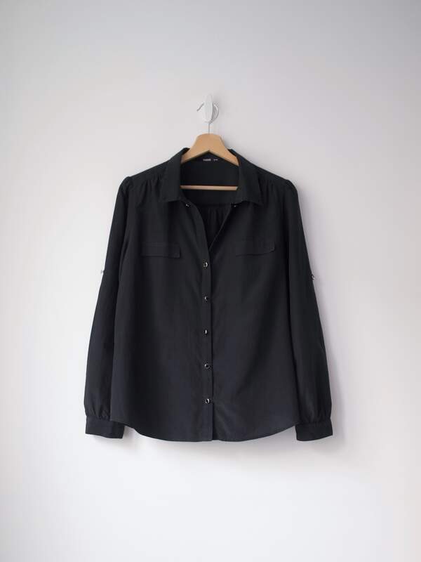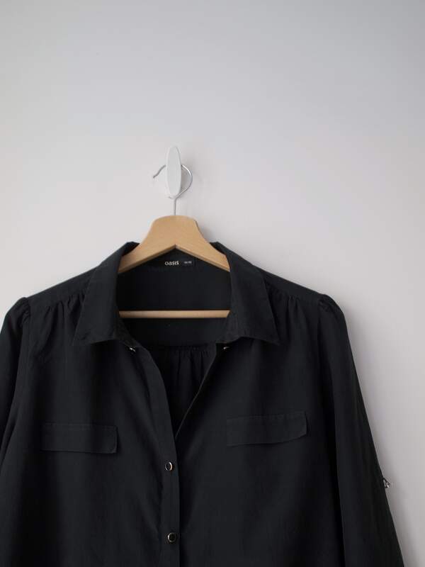 Cienka bluzka, wykonana z miłej w dotyku tkaniny. Rozmiar z metki: 40 Skład: 52% jedwab, 48% bawełna Stan: bez wad Szerokość w klatce 52, 5 cm Długośćcałkowita 67 cm