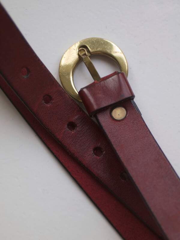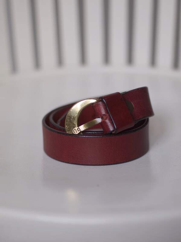 Burgundowy pasek vintage, luksusowa marka Etienne Aigner. Klamra zdobiona logiem marki.