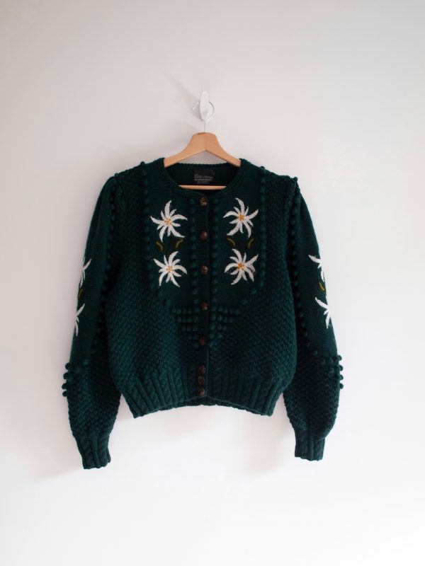 320,00 złUnikatowy kardigan vintage, wykonany ręcznie w Austrii. Uszyty z ciemnozielonej wełny, zdobiony haftem przedstawiającym alpejskie szarotki. Pudełkowy fason.