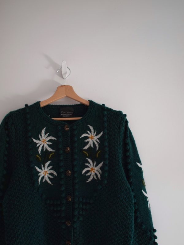 320,00 złUnikatowy kardigan vintage, wykonany ręcznie w Austrii. Uszyty z ciemnozielonej wełny, zdobiony haftem przedstawiającym alpejskie szarotki. Pudełkowy fason.