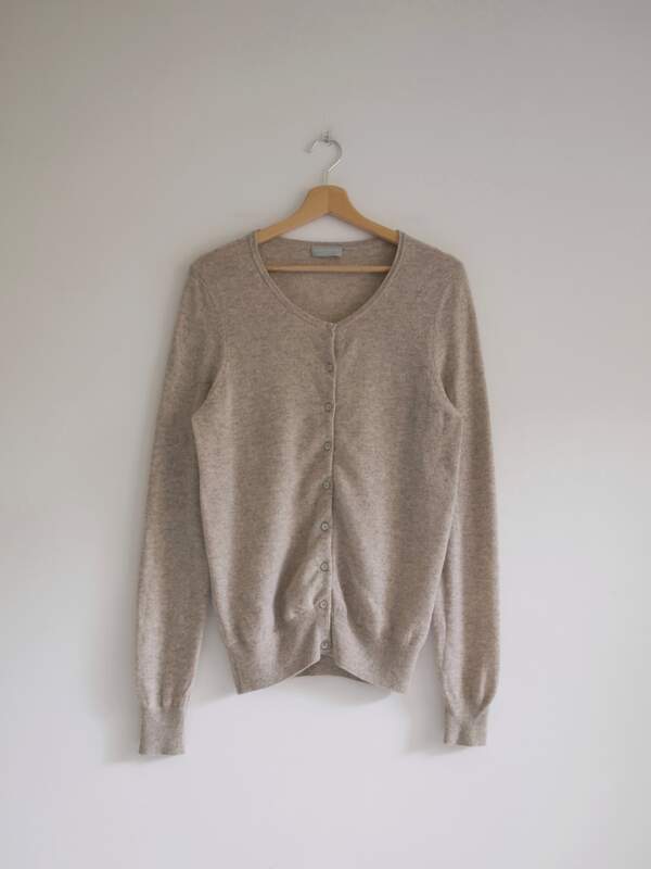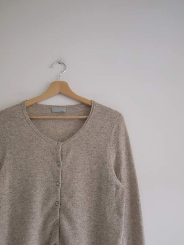 Kardigan w kolorze szarobeżowego melanżu, angielska marka The White Company. W 100% wykonany z kaszmiru, bardzo miękki i miły w dotyku. Ma parę cerowań, gubią się w melanżu i są absolutnie nie widoczne.
