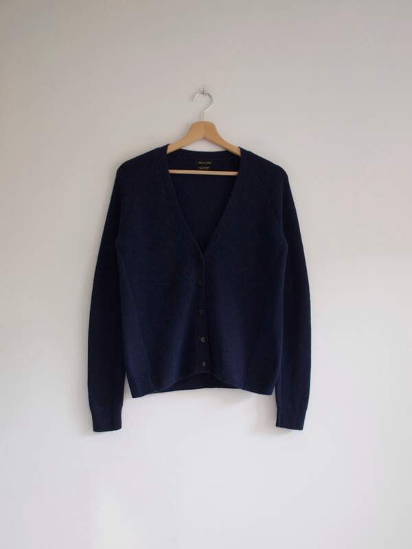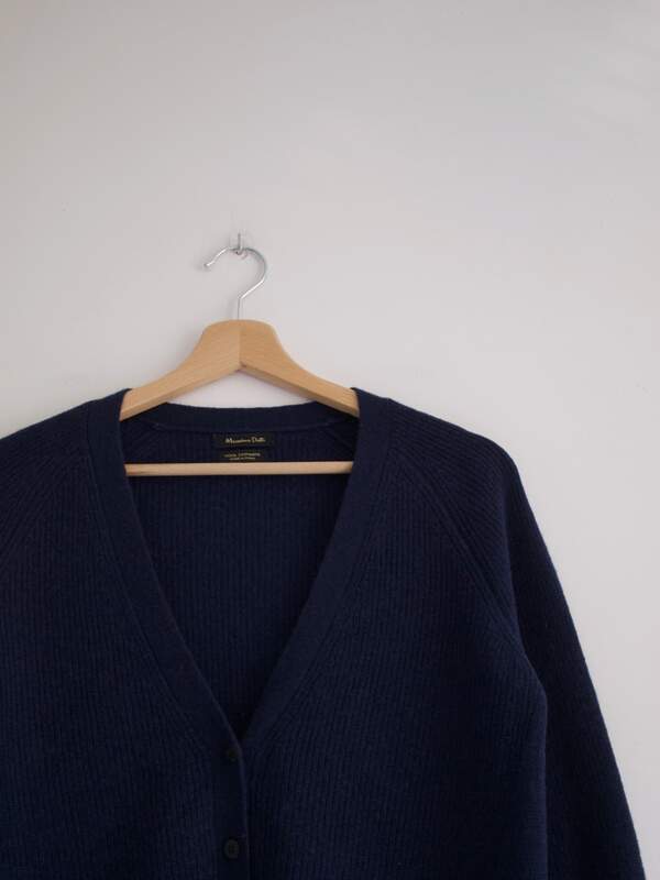Granatowy kardigan marki Massimo Dutti, wykonany z wełny z dodatkiem kaszmiru. Miły i niegryzący.