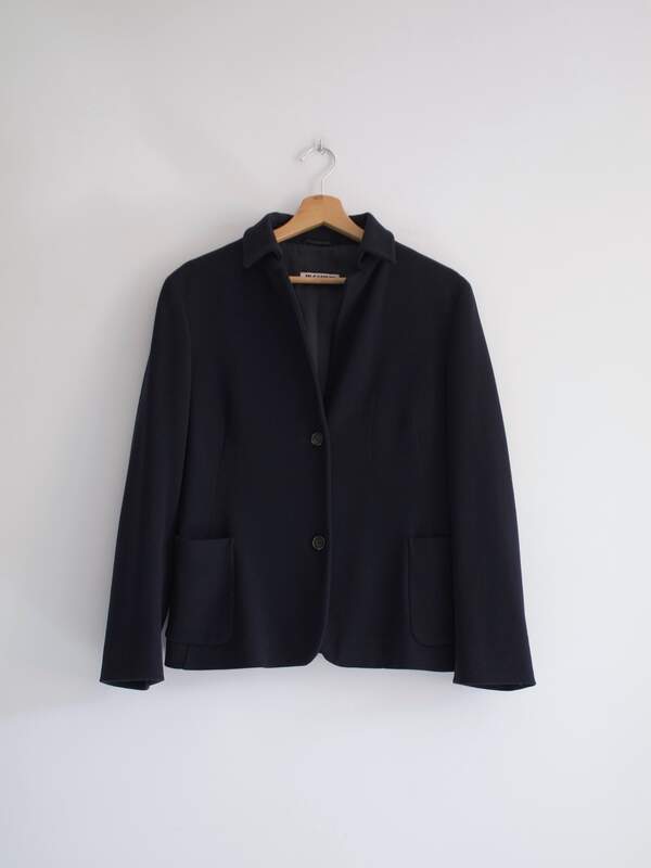 250,00 złWełniana marynarka domu mody Jil Sander. Wykonana z grubszej wełny, może być noszona jako lekka kurtka. Zapinana na wda guziki, w środku jedna kieszonka.