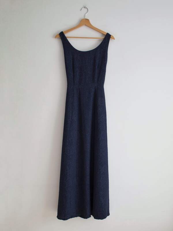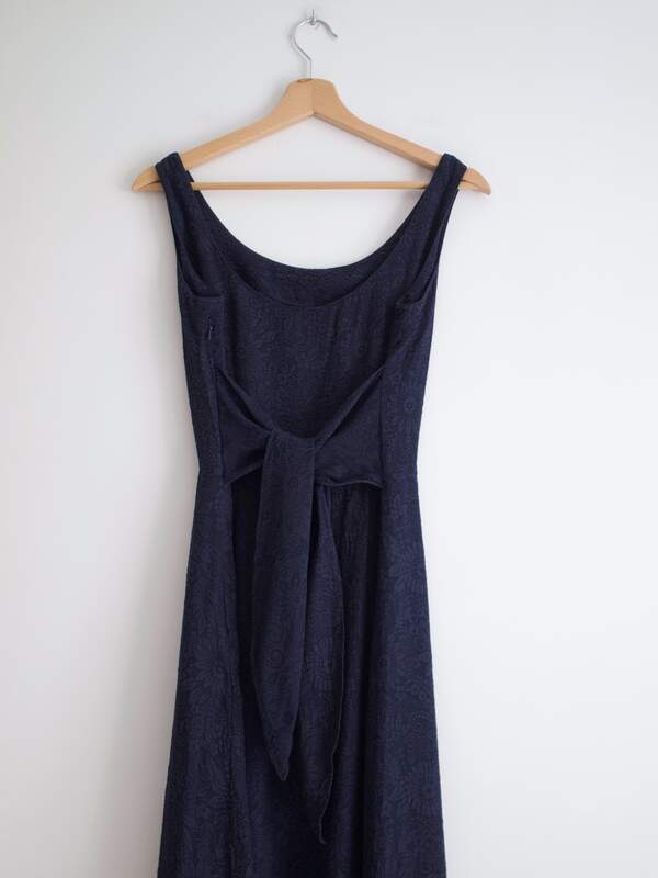 170,00 zł127,00 złSukienka vintage w kolorze granatowym. Wykonana z jedwabnej tkaniny w wytłaczane wzory. Zapinana na boczny zamek, z tyłu wiązanie.