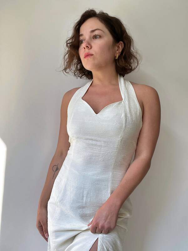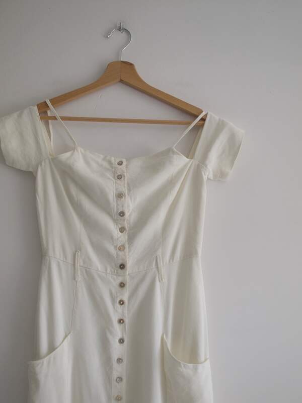 300,00 zł270,00 złUnikatowa sukienka vintage, szyta według czyjegoś projektu. Wykonana z jedwabiu szantung, w perłowym kolorze oraz o charakterystycznej strukturze. Sukienka o dopasowanym fasonie, z tyłu zapinana na suwak.