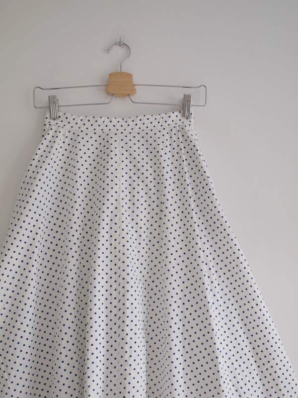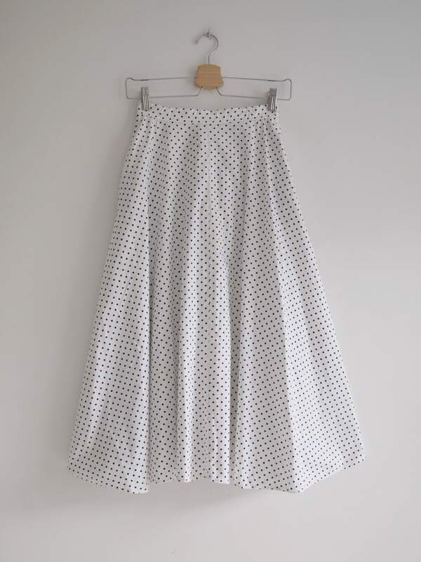 Unikatowa spódniczka vintage, prawdopodobnie szyta na zamówienie. Z tyłu zapinana na zamek i guzik, z kieszeniami. Malutka w pasie, więc proszę sprawdzić wymiary.