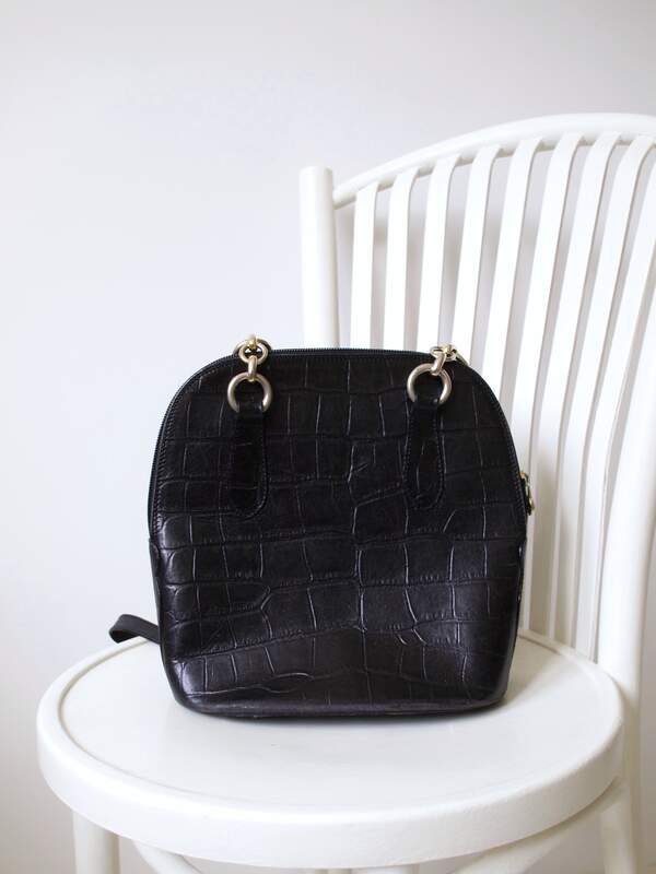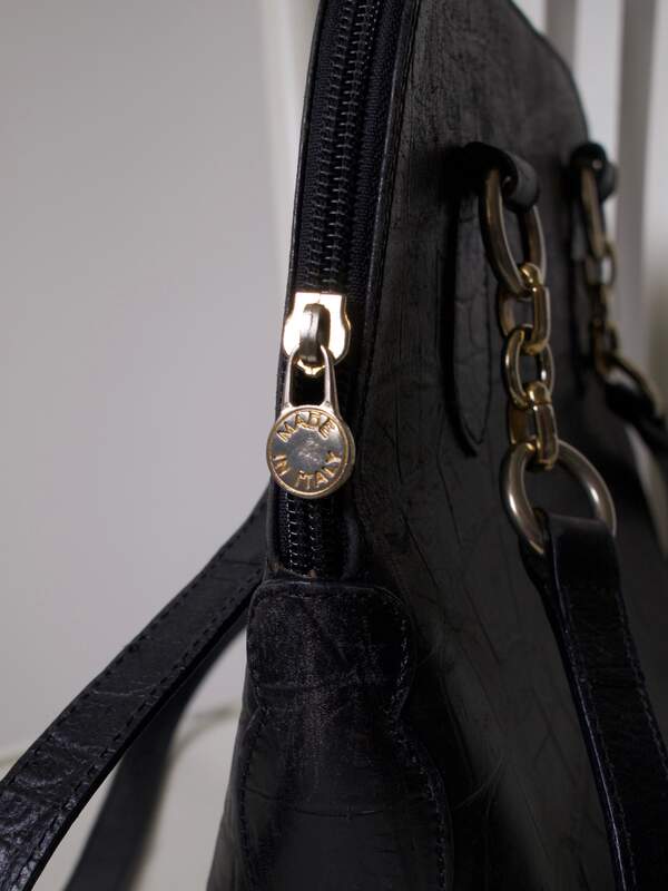 Torebka ze skóry naturalnej, tłoczonej we wzór skóry krokodyla. Wyprodukowana we Włoszech. W środku jedna komora oraz mała kieszonka. Jedna rączka była wzmacniana przez poprzedniego właściciela, nie jest to widoczne. Poza tym bardzo dobry stan.