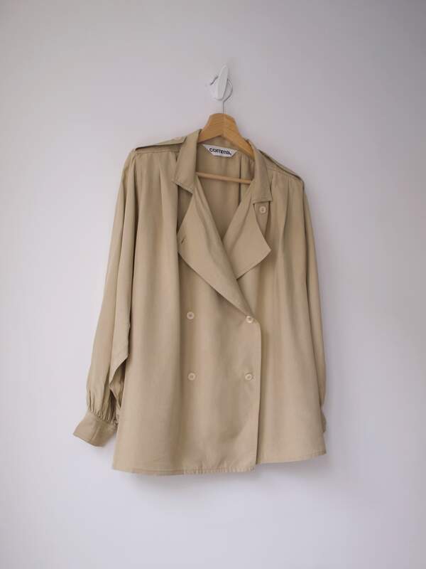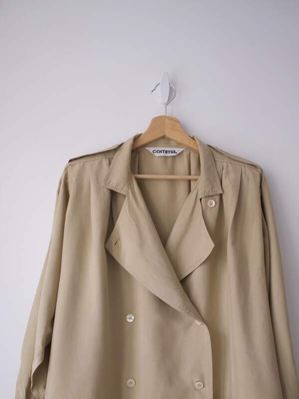 Krótki trencz niemieckiej marki Comma, prawdopodobnie model vintage. W 100% wykonany z jedwabiu, bez podszewki.