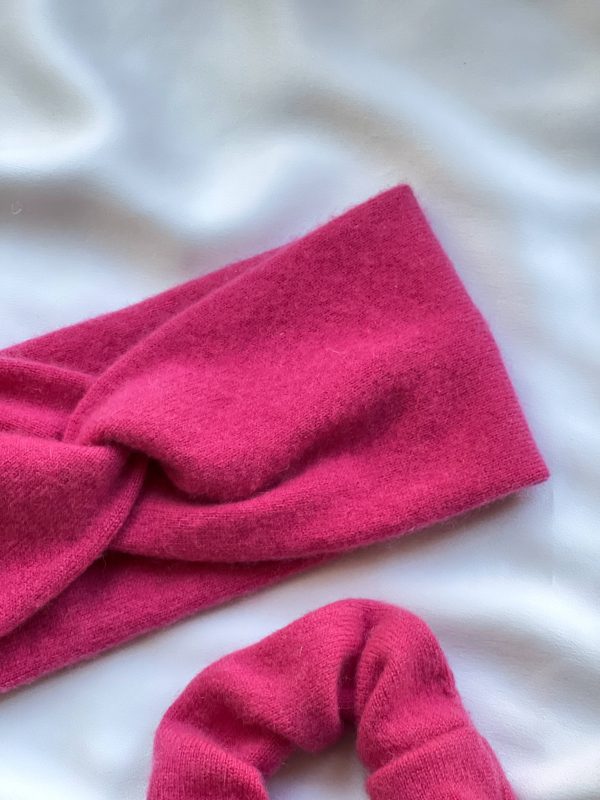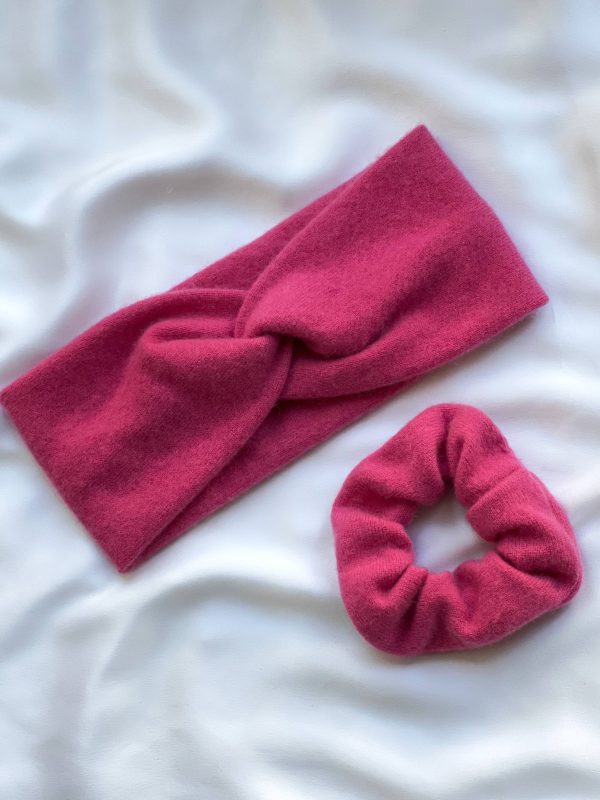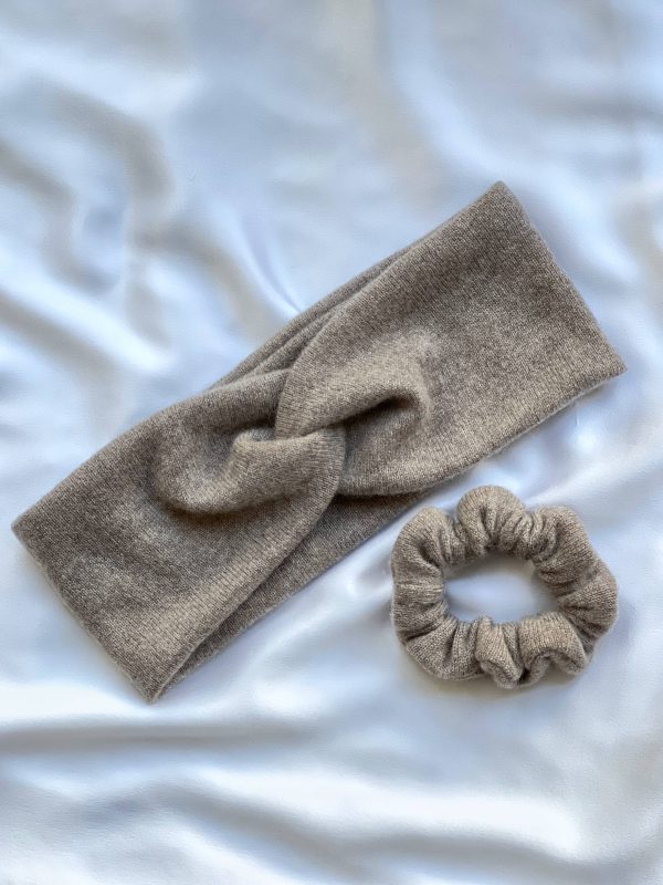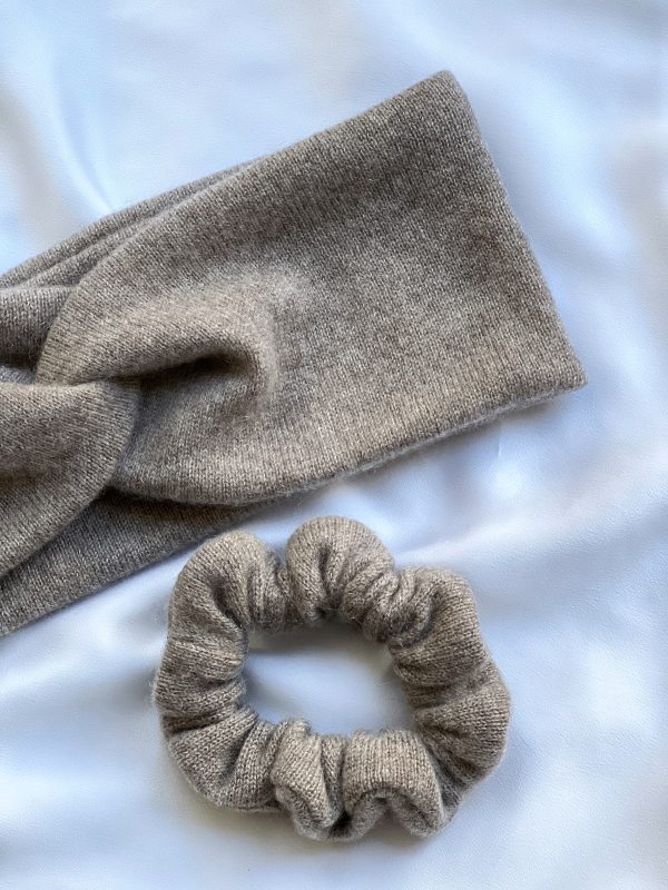 Kaszmirowy zestaw składający się z ciepłej opaski oraz gumki do włosów. 100% kaszmir z odzysku.