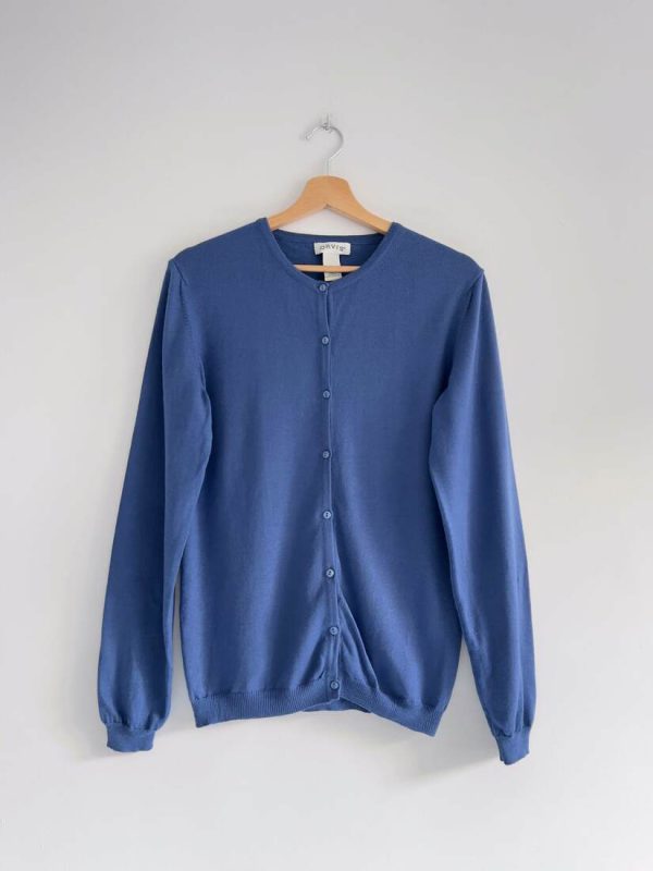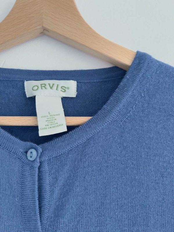 Kardigan amerykańskiej marki Orvis. Wyprodukowany we Włoszech w 100% z wełny merynosa. Rozmiar z metki L, bardzo dobry stan.