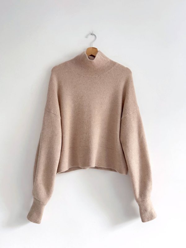 Dopasowany kaszmirowy sweter. Jest delikatnie sfilcowany, nie jest to widoczne i nie przeszkadza w noszeniu, sweter jest miękki i puszysty. Polecam na XS.