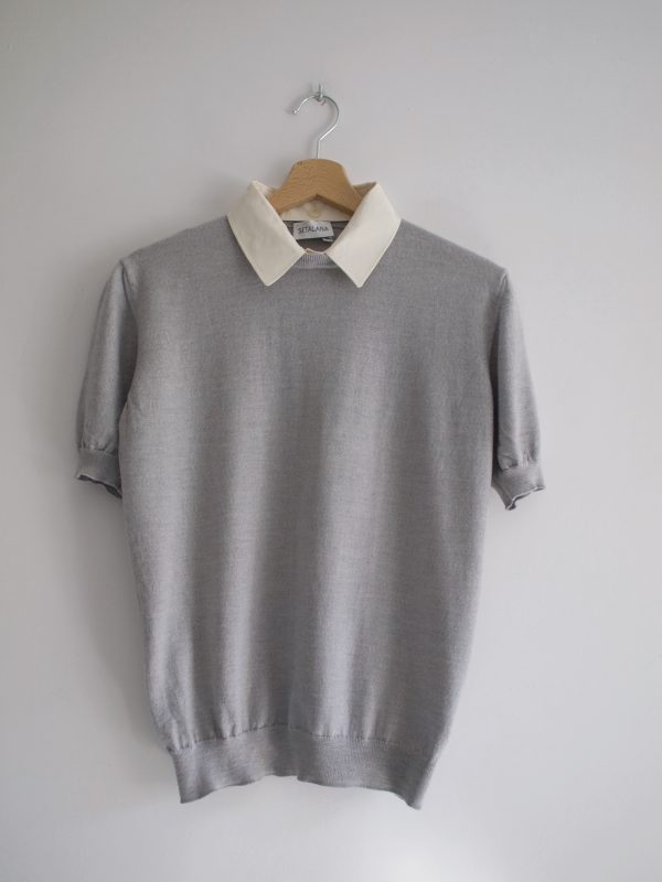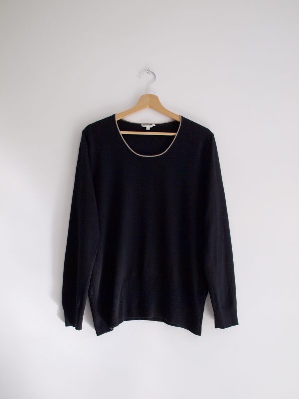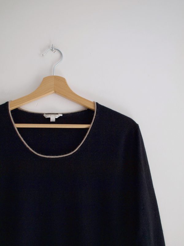 Sweter z odpinanym jedwabnym kołnierzem. Wykonany z miłej w dotyku mieszanki wełny merynosa, jedwabiu i kaszmiru. Będzie pasować na r.M. Ma malutką plamkę, jest zaznaczona na zdjęciu. Nie widoczna w noszeniu.