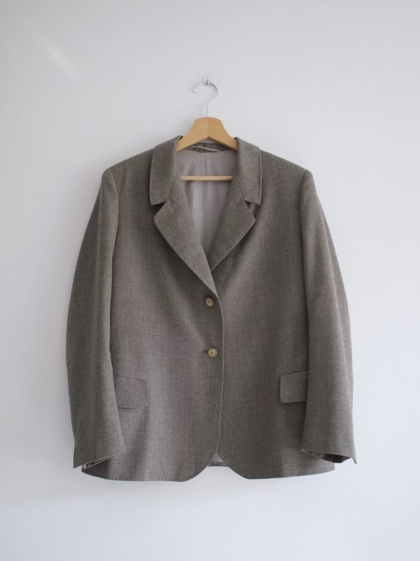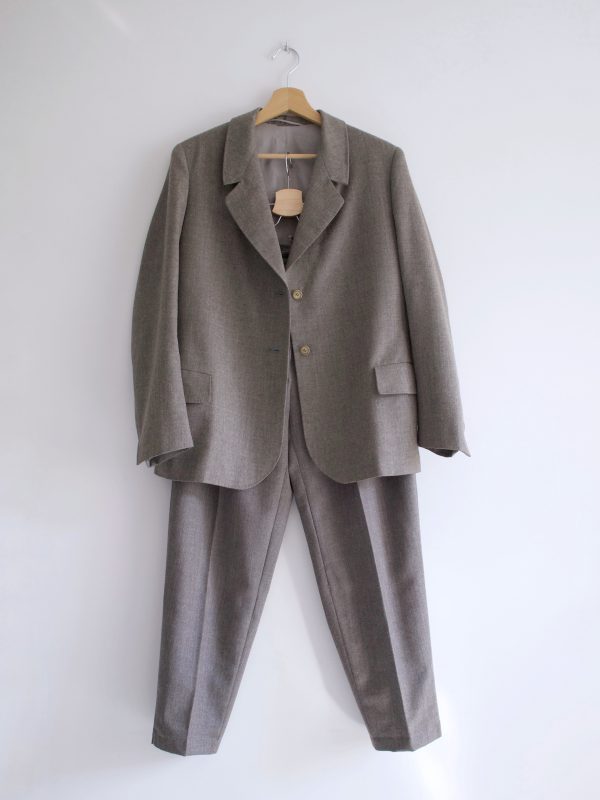 Unikatowy wełniany garnitur szyty na zamówienie. Marynarka o prostym, luźnym fasonie, z podszewką. Klasyczne spodnie z zaszewkami, bez kieszeni. Brak metki z rozmiarem, proszę sugerować się wymiarami. Bez wad.