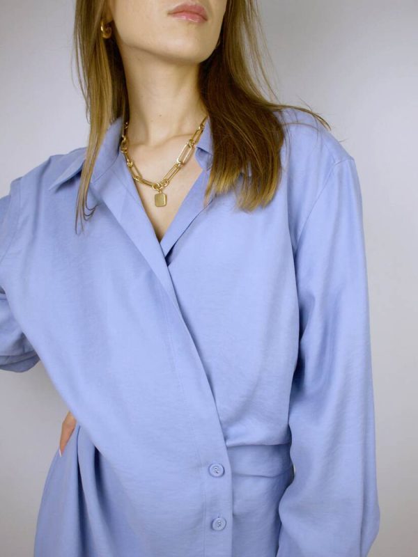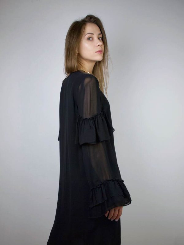 Skład: materiał wierzchni jedwab, podszewka – brak informacji, prawdopodobnie syntetyk. Modelka ma 165 cm wzrostu i nosi rozmiar XS-S.