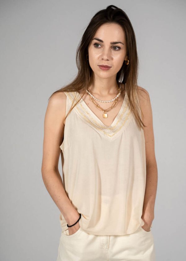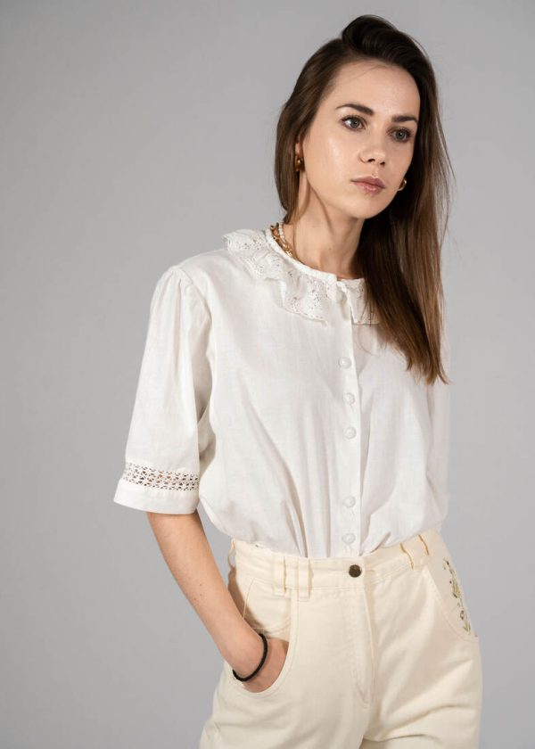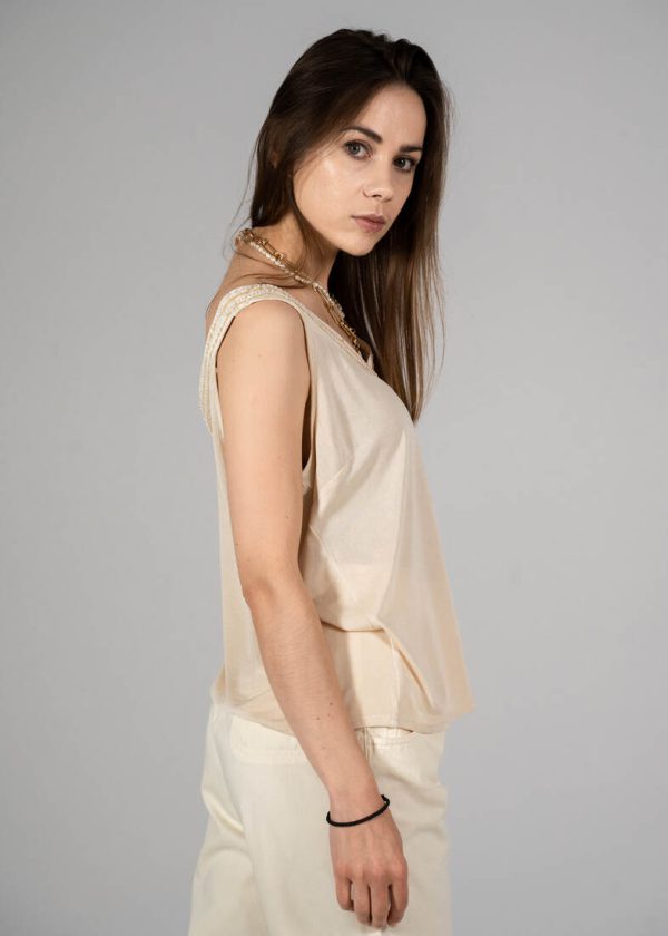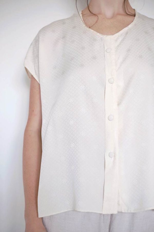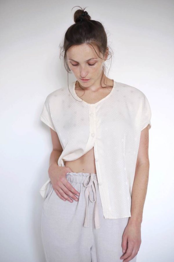 Skład: 70% bawełna, 30% len. Modelka ma 165 cm wzrostu i nosi rozmiar XS-S.Szerokość w ramionach 38 cm