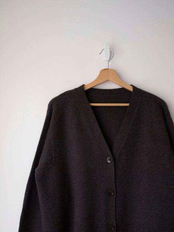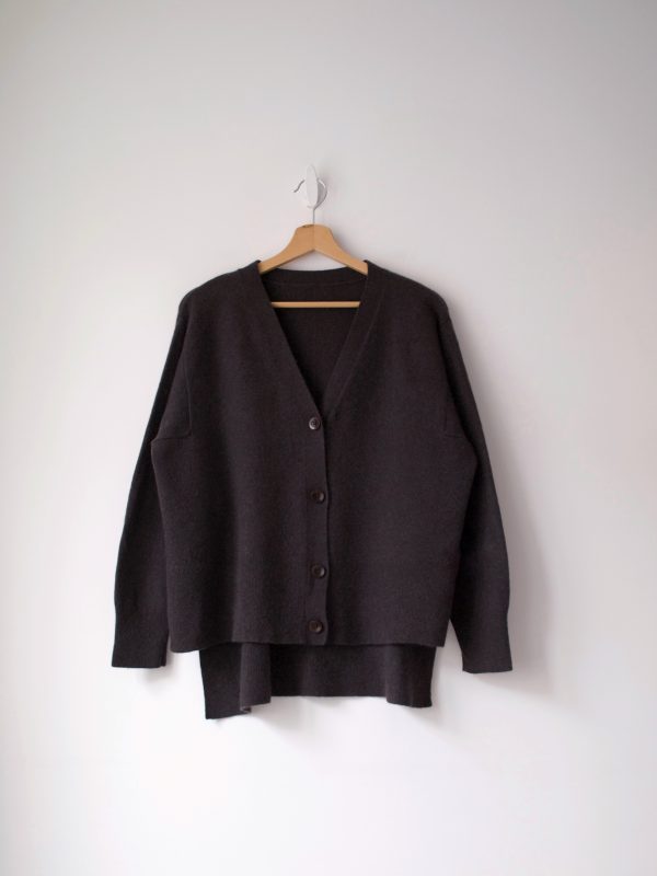 Brązowy kardigan o pudełkowym fasonie. Wycięta metka ze składem, według mnie kaszmir i wełna.