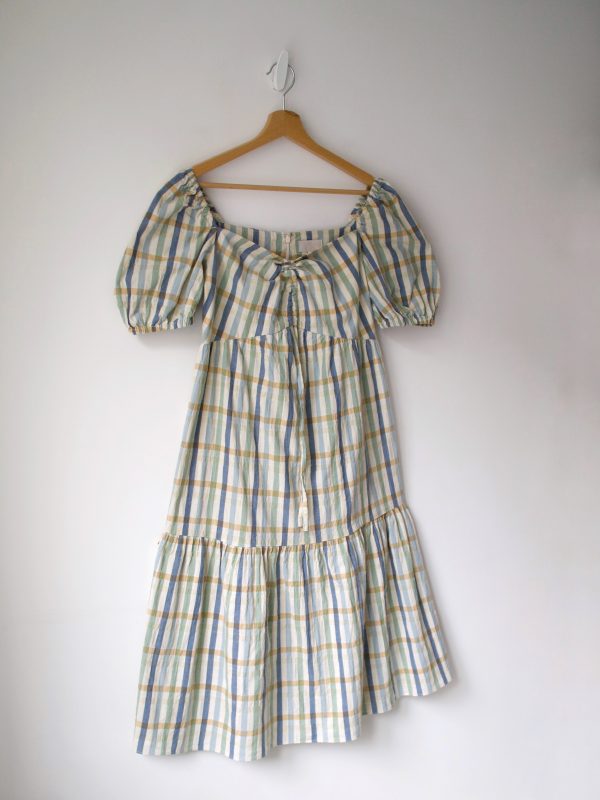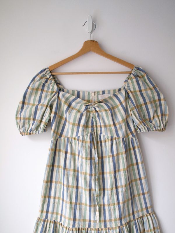 Sukienka w kratę brytyjskiej marki Feather and Bone, wykonana z teksturowanej bawełny, zapinana z tyłu na ukryty zamek.