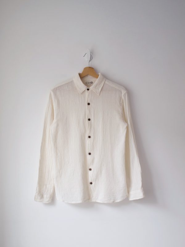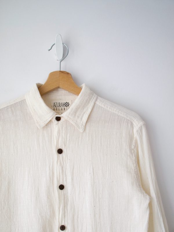 Koszula brytyjskiej marki Azurak Organic, specjalizującej się w produkcji ubrań z organicznych materiałów, bez użycia barwników i chemii. Wykonana jest z niebielonej bawełny organicznej i zapinana na guziki z kokosa.