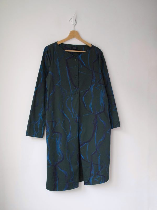 Sukienka marki COS o kroju A-line z długim rękawem, ozdobion. Wykonana z przewiewnej bawełny z domieszką elastanu. Ma dyskretne kieszenie, zakładkę z przodu i zapięcie na trzy guziki.