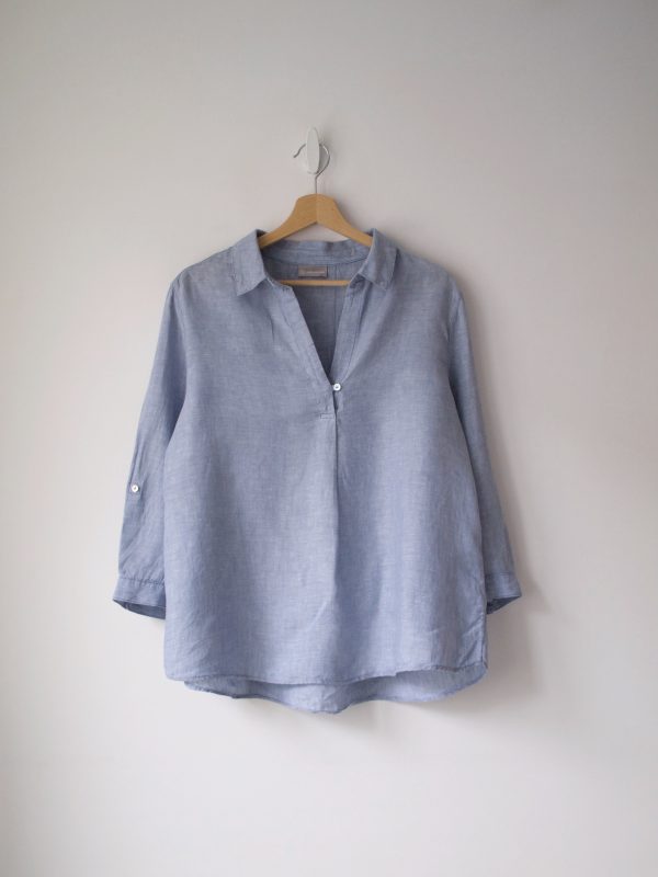 Lniana bluzka o luźnym fasonie. Zapinana na guziki z naturalnej muszli.