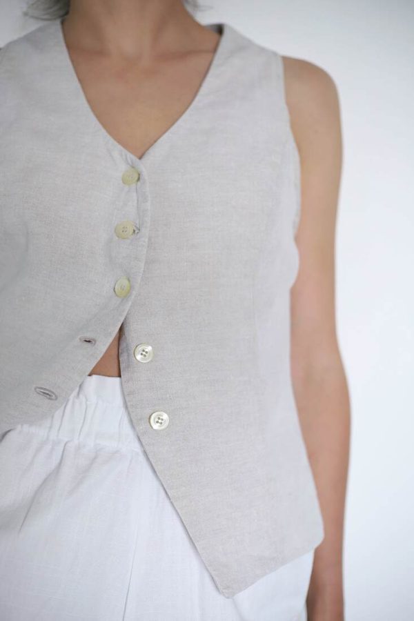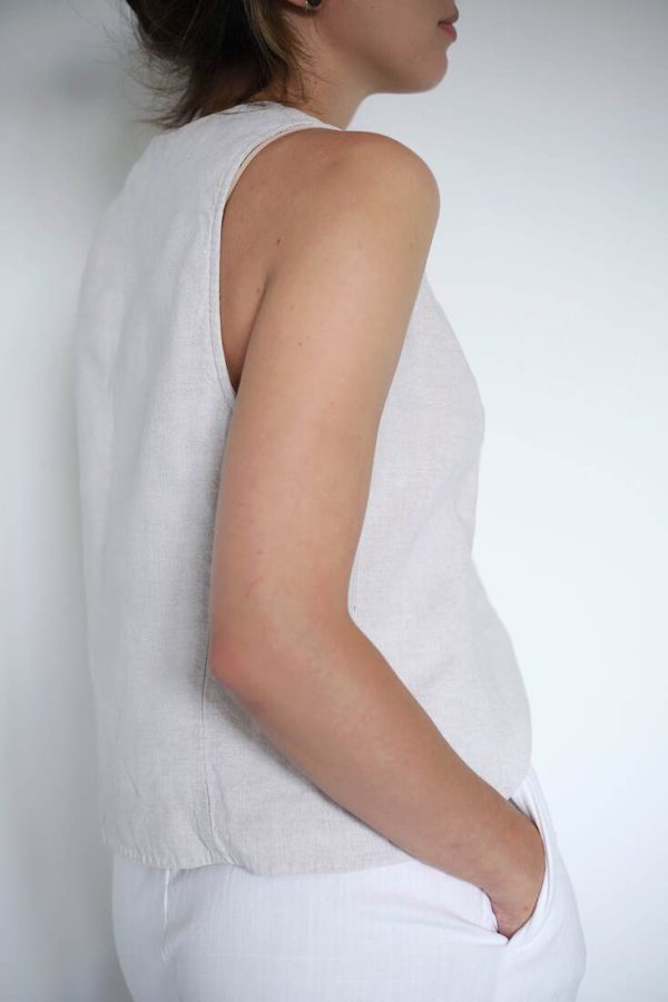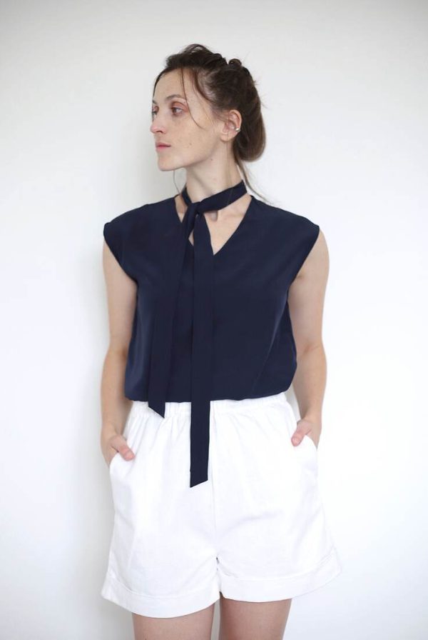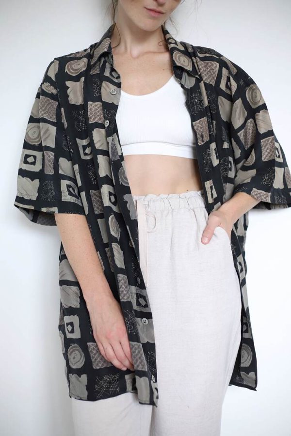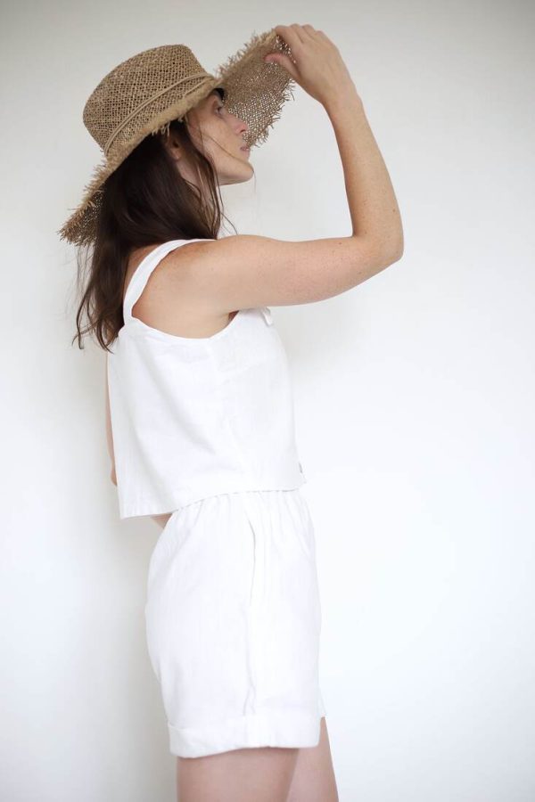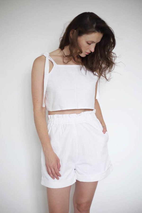150,00 złZestaw upcycled szyty z bawełnianej zasłony. Spodenki z kieszeniami i gumką w pasie, top na szerokich ramiączkach, zapinany na guziki z naturalnej muszli. Będzie pasować na rozmiar XS-S-M