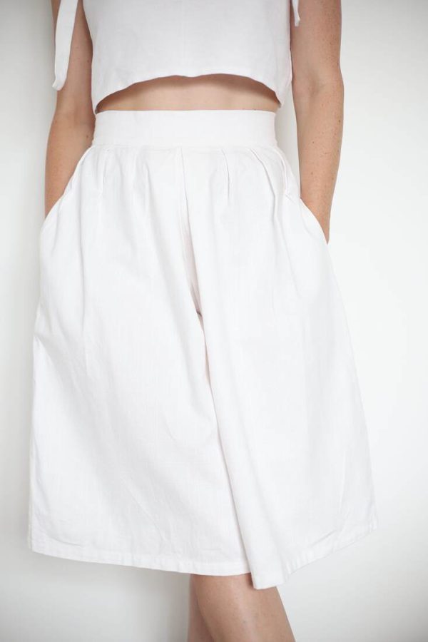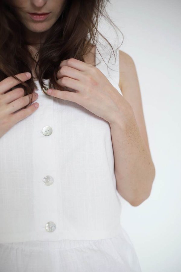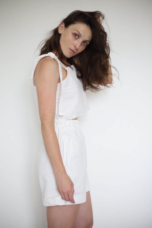 150,00 złZestaw upcycled szyty z bawełnianej zasłony. Spodenki z kieszeniami i gumką w pasie, top na szerokich ramiączkach, zapinany na guziki z naturalnej muszli. Będzie pasować na rozmiar XS-S-M