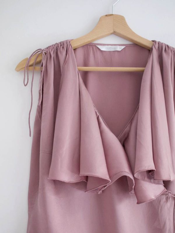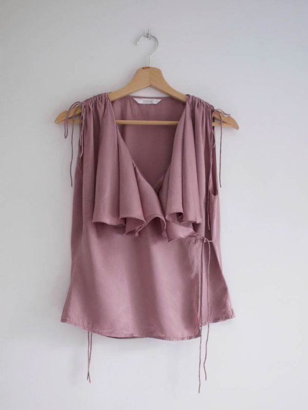 Jedwabna bluzka z falbankami. Kolor jak na ostatnim zdjęciu. Rozmiar z metki 38, polecam na S-M. Bardzo dobry stan.