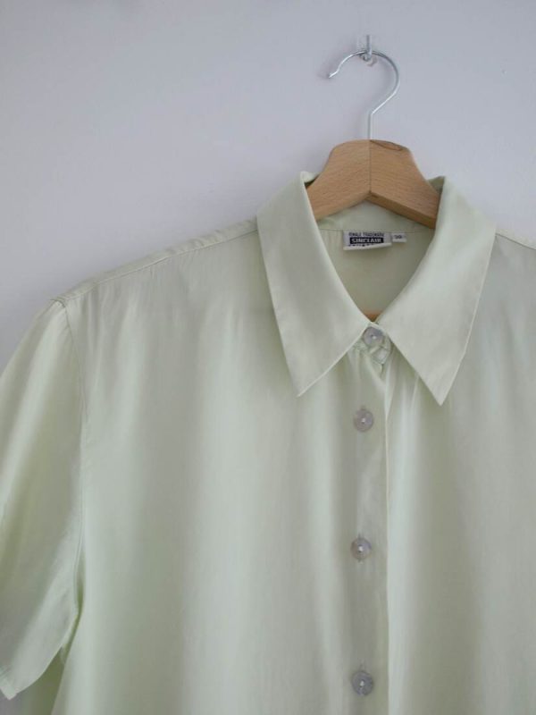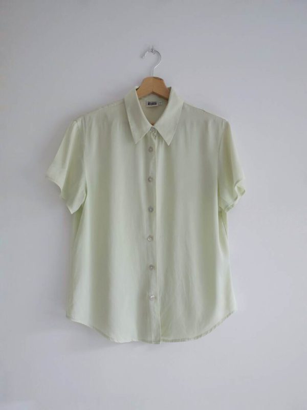 Jedwabna koszula vintage w pistacjowym kolorze. Zapinana na guziki z naturalnej muszli. Rozmiar z metki 38, bardzo dobry stan.