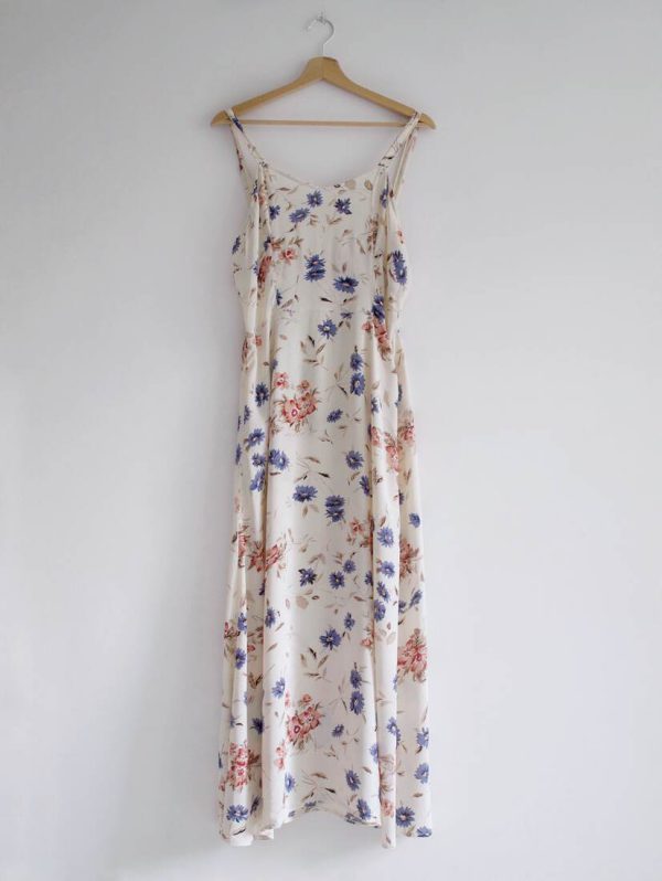 Sukienka vintage w kremowym kolorze, z pięknym wzorem polnych kwiatów. Z tyłu zapięcie na suwak. Rozmiar z metki 38, polecam dla osoby wysokiej. Bez wad.