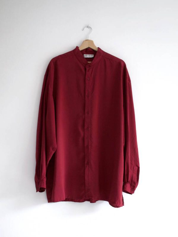 Obszerna jedwabna koszula w burgundowym kolorze. Materiał w delikatny prążek. Rozmiar z metki XL, bez wad.