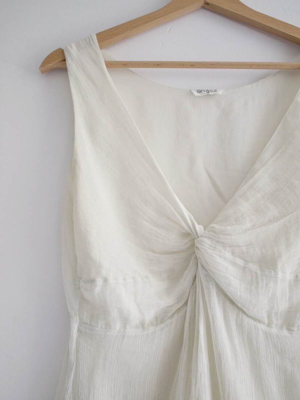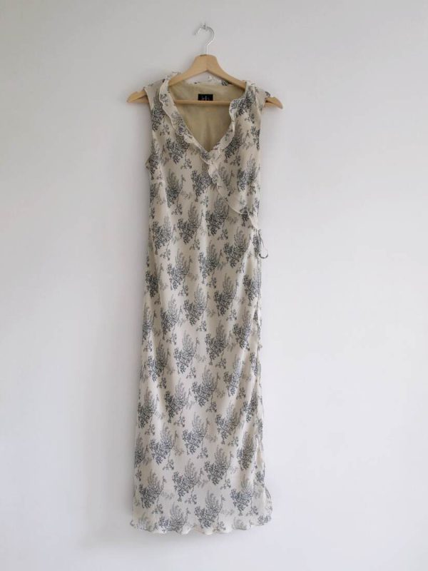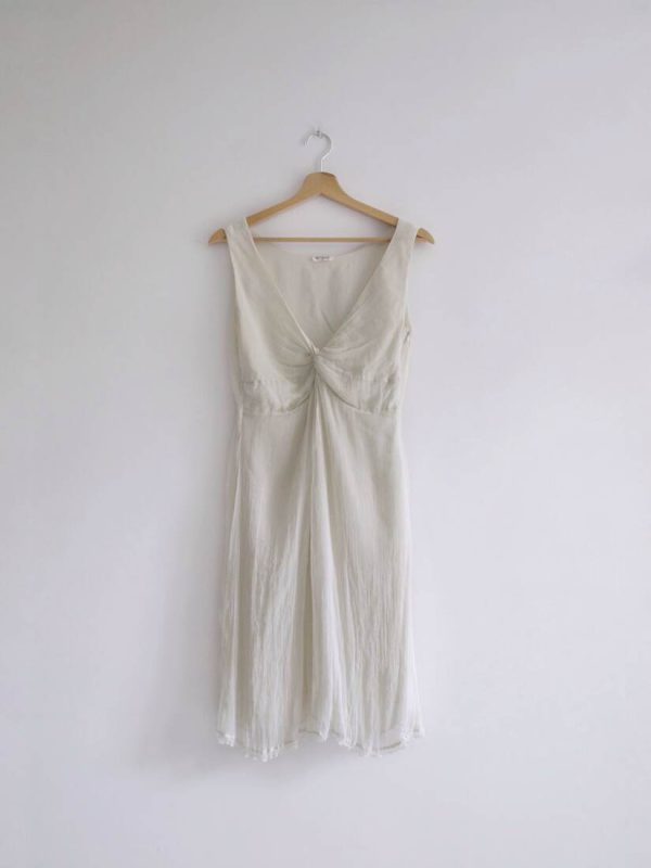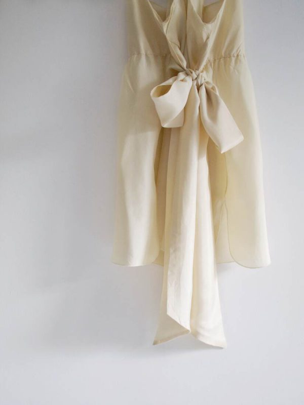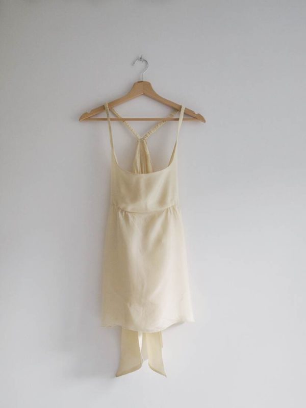 Sukienka vintage, w 100% wykonana z jedwabiu. Rozmiar z metki M, moim zdaniem może być zbyt dopasowana, więc polecam na S. Ogólnie bardzo dobry stan, sukienka nie jest śnieżno biała, kolor to złamana biel.