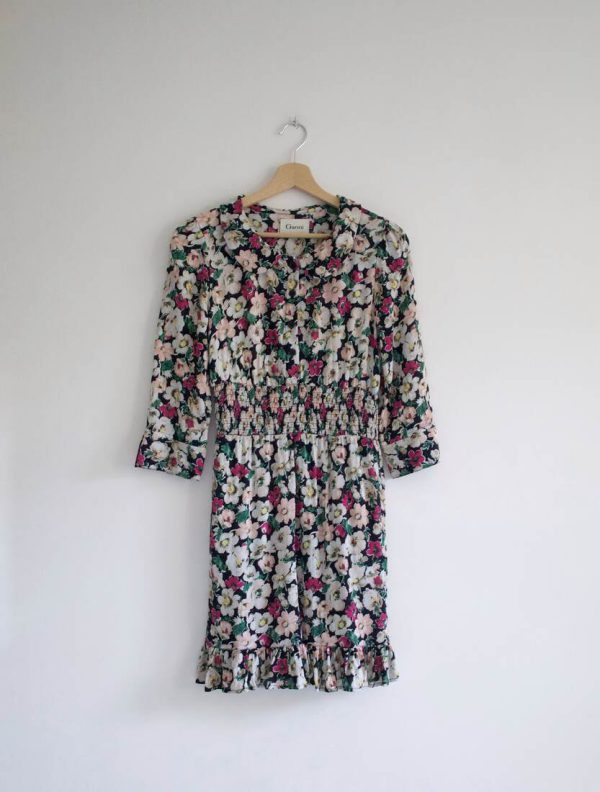 Sukienka marki GANNI w kwiatowe wzory. Rozpinany kołnierzyk, elastyczna w talii, podszewka w dolnej części. Rozmiar z metki S, polecam na XS-S. Bez wad.