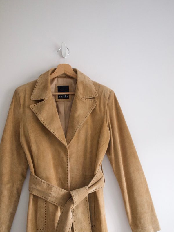 Unikatowy płaszcz vintage, w 100% wykonany z naturalnej skóry zamszowej. Klasyczny fason, z podszewką oraz paskiem.