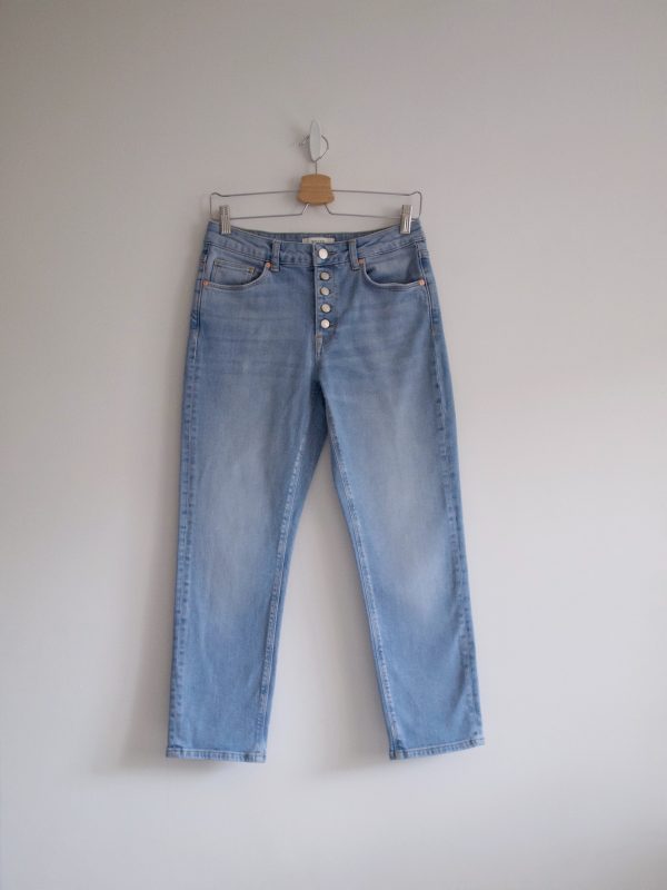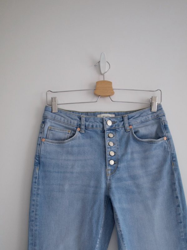 Jeansy ekskluzywnej marki Reiss ze średnim stanem. Cena na stronie marki: £110. Zapinane na metalowe, logowane guziki.