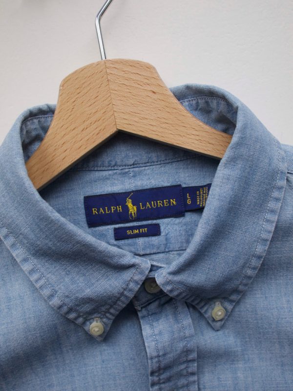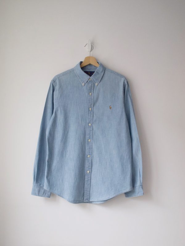 Koszula w kolorze niebieskiego melanżu, renomowana marka Ralph Lauren. Zapinana na guziki z naturalnej masy perłowej.