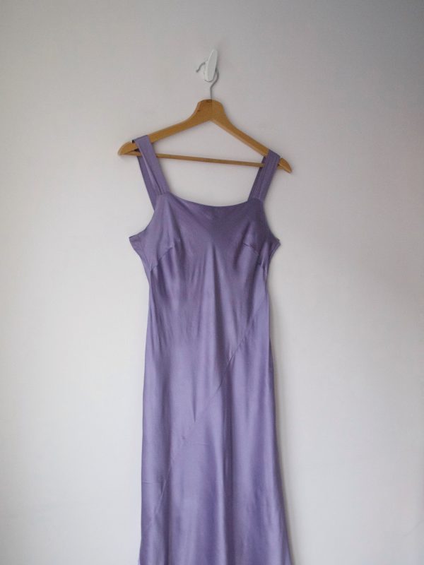 Jedwabna sukienka duńskiej marki Tone Barker. Marka ta specjalizuje się w produkcji ubrań wysokiej jakości w ograniczonych ilościach, a koszt zakupu jedwabnej sukienki na stronie tej marki to wydatek ponad 1000 zł. Sukienka wykonana z jedwabnej satyny w kolorze liliowym, szyta ze skosu, pięknie się układa. Bez podszewki