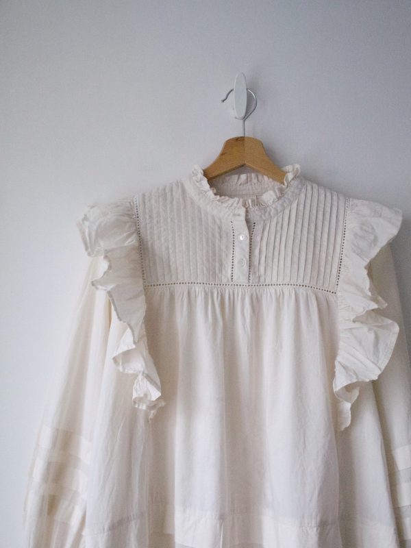 Bluzka skandynawskiej marki Part Two, model Keera Frilled Blouse, cena katalogowa 90 euro. Bluzka w kolorze kremowym, dekolt zapinany na małe guziki, bardzo luźny fason.