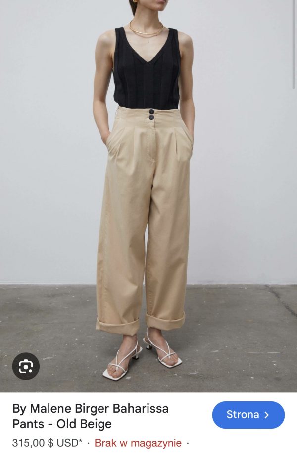 Spodnie luksusowej skandynawskiej marki By Malene Birger. Model Baharissa, cena katalogowa 315 USD. Spodnie o luźnych nogawkach, z wysokim stanem.