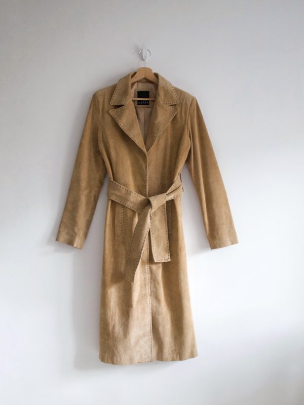 Unikatowy płaszcz vintage, w 100% wykonany z naturalnej skóry zamszowej. Klasyczny fason, z podszewką oraz paskiem.