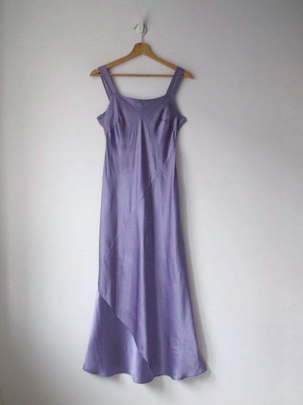 Jedwabna sukienka duńskiej marki Tone Barker. Marka ta specjalizuje się w produkcji ubrań wysokiej jakości w ograniczonych ilościach, a koszt zakupu jedwabnej sukienki na stronie tej marki to wydatek ponad 1000 zł. Sukienka wykonana z jedwabnej satyny w kolorze liliowym, szyta ze skosu, pięknie się układa. Bez podszewki