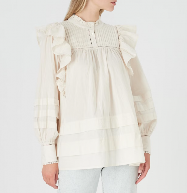 Bluzka skandynawskiej marki Part Two, model Keera Frilled Blouse, cena katalogowa 90 euro. Bluzka w kolorze kremowym, dekolt zapinany na małe guziki, bardzo luźny fason.