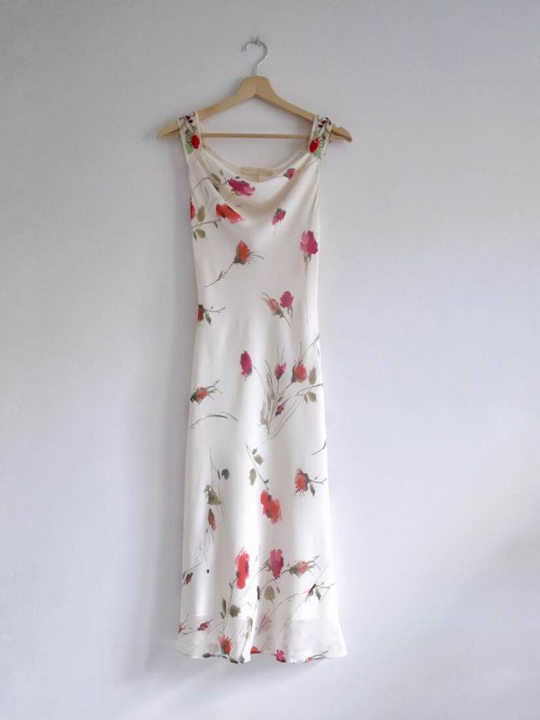 80,00 złSukienka vintage w piękne akwarelowe kwiaty. Materiał wierzchni 100% jedwab, podszewka 100% acetat. Z tyłu na dole ma malutkie przetarcie, pokazane na ostatnim zdjęciu. Nie jest widoczne w noszeniu. Poza tym bez wad.