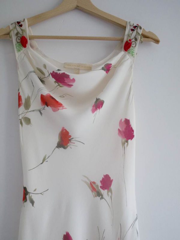 80,00 złSukienka vintage w piękne akwarelowe kwiaty. Materiał wierzchni 100% jedwab, podszewka 100% acetat. Z tyłu na dole ma malutkie przetarcie, pokazane na ostatnim zdjęciu. Nie jest widoczne w noszeniu. Poza tym bez wad.