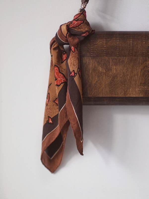 Unikatowa jedwabna apaszka Dior z lat 60-70. Ma wyblakłe paski, prawdopodobnie wskutek nieodpowiedniego prania. Nie jest to widoczne w noszeniu na szyi lub torebce. 77×76 cm