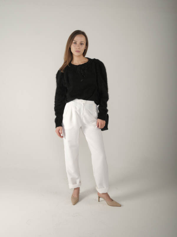 Minimalistyczne wełniane spodnie wyprodukowane w Szwajcarii. Rozmiar z metki 40, w rzeczywistości jest mniejszy. Modelka ma 175 cm wzrostu. idealny stan