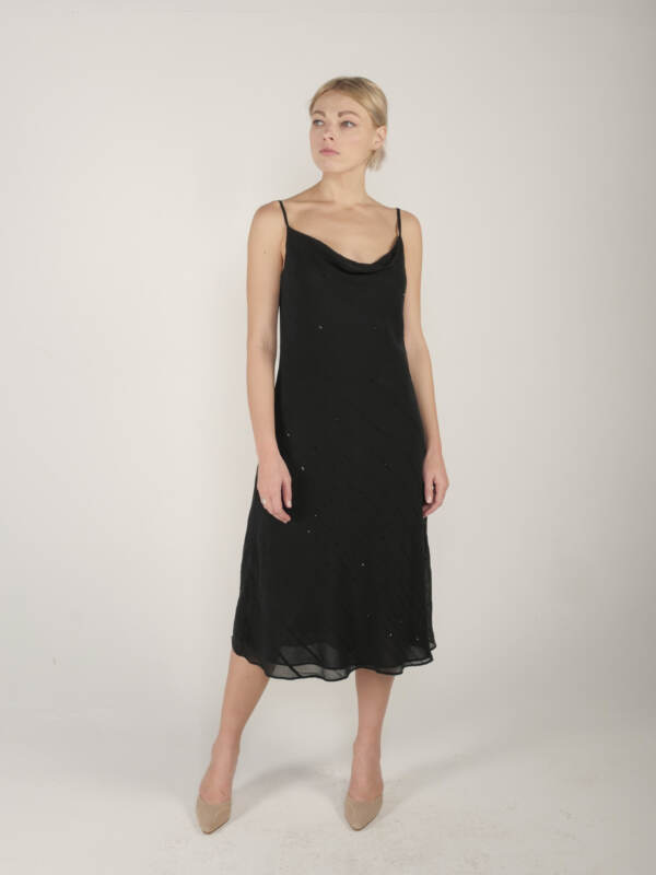 Minimalistyczna jedwabna sukienka, delikatnie zdobiona cekinami, idealna na stylizację w stylu lat 20ch. Rozmiar z metki 14, będzie dobra na S/M. Wymiary na płasko: w biuście ok. 43 cm, biodra 46, długość razem z ramiączkami ok 109 cm. Modelka ma 175 cm wzrostu.