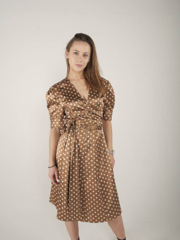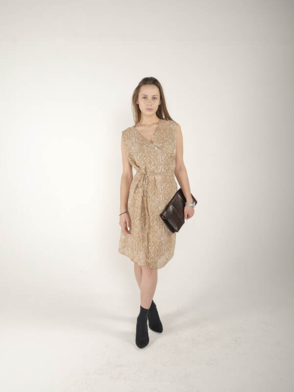 Kopertowa sukienka z wiskozy w idealnym stanie. Podszewka, w pasie wiązanie. Rozmiar z metki 38, modelka ma 165 cm wzrostu.