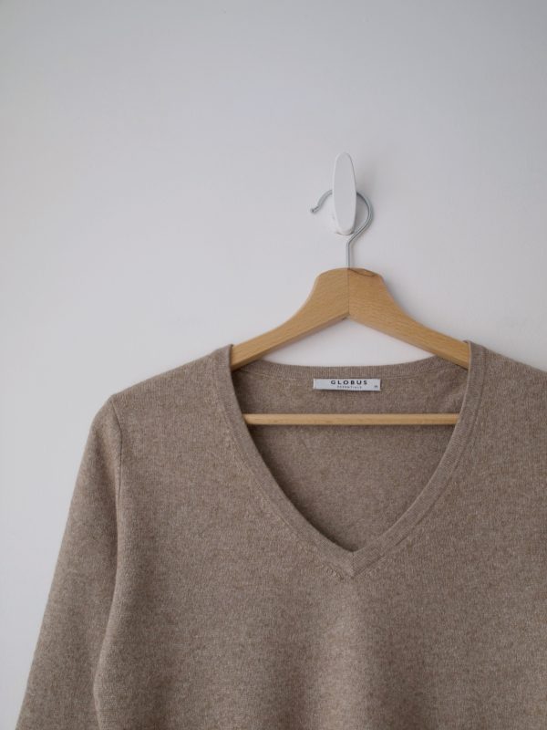 Sweter o klasycznym fasonie, wykonany z mieszanki kaszmiru i jedwabiu. Kolor to beżowy melanż. Sweter jest delikatnie sfilcowany, nie jest to ani widoczne ani wyczuwalne w noszeniu.