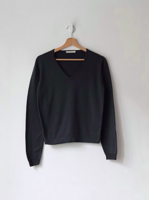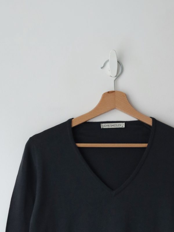 Sweter luksusowej brytyjskiej marki John Smedley. Wykonany z cienkiej i niegryzącej wełny w kolorze grafitowym. Cena podobnego modelu na stronie marki 1300 zł.